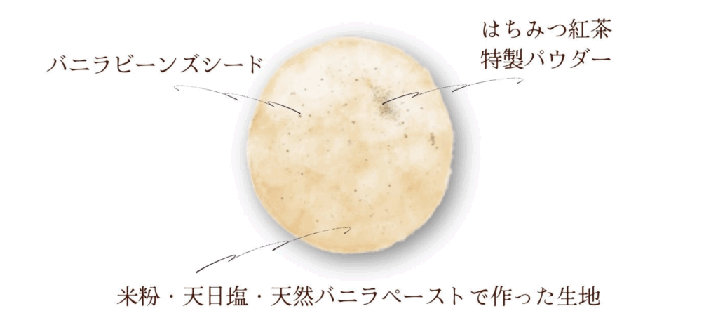 国産製造の米粉、海⽔100%の天⽇塩「ゲランドの塩」・天然バニラビーンズペースト・⽼舗あんこメーカーのバニラが⾹る⼤⾖ペースト。こだわり抜いた素材達が織りなす、絶妙なハーモニー。
